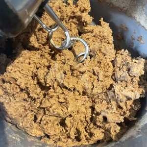 Leinmehl zugeben und mit Knethaken zu einer einheitlichen Masse kneten.