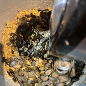 Sonnenblumen- und Kürbiskerne hinzugeben und vorsichtig verkneten, bis die Kerne gleichmäßig verteilt sind.